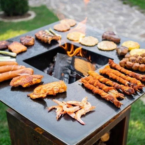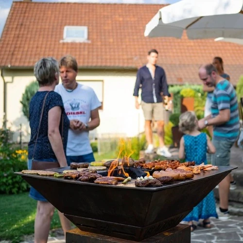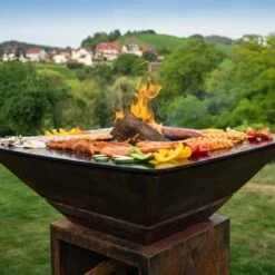 - Lieferumfang: Sockel, Feuerwanne, Grillplatte, Ascheschublade, zweiteiliges Ascheblech