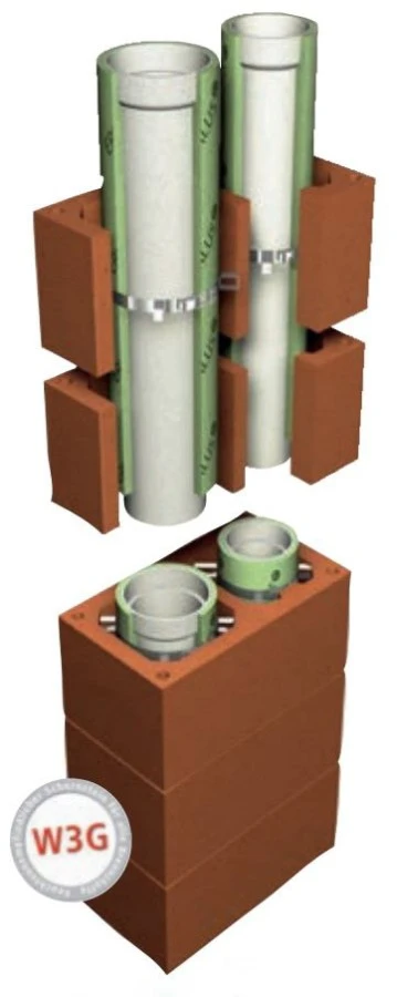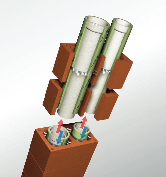 Durch die innovative Verbindungstechnik ist die Zusammensetzung des Systems schnell, einfach und sicher. Die gedämmten Keramikrohre werden mittels Muffe miteinander verbunden. Alternativ ist neben der Steckverbindung auch die Verwendung der keramischen Gewebedichtung möglich. Um die Schornsteinrohre herum befinden sich Leichtbeton-Mantelsteine.