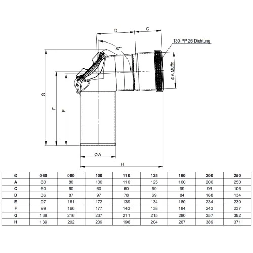 Reinigungswinkel aus Kunststoff 87°. Einwandige, flexible Systemabgasleitung aus Kunststoff für Brennwertfeuerstätten.